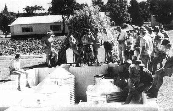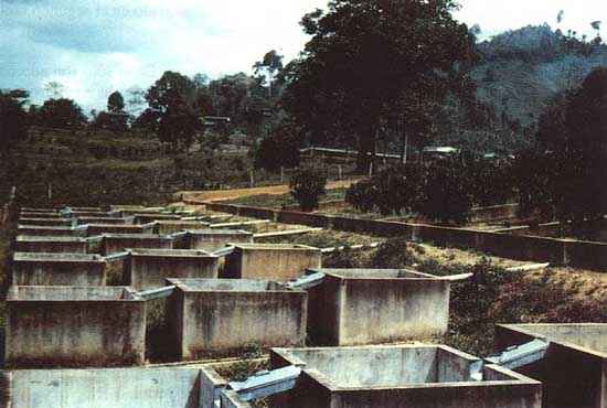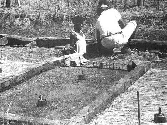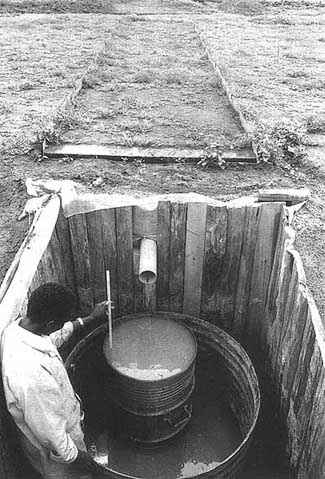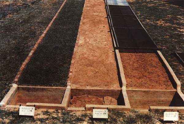 Uno de los mejores usos de las parcelas de escorrentía es la demostración, cuando la finalidad es demostrar hechos conocidos. Entre otros ejemplos, para mostrar a los agricultores que se está produciendo una erosión grave o mostrarles que la erosión es mucho menor en una parcela que está cubierta de vegetación que en una parcela desnuda. En este caso las magnitudes reales de la erosión no son importantes por lo que no es necesario proceder a repeticiones ni recurrir a sistemas colectores complicados que tratan de captar toda la pérdida de suelo. Las parcelas representadas en la Fotografía 4 sólo teman sencillas cisternas de ladrillo en las que fluía la escorrentía y la pérdida de suelo y que rebosaban cuando habían grandes tormentas por lo que sólo una proporción de la pérdida de suelo se recogía en los colectores; sin embargo, eran muy eficaces para demostrar a un gran número de agricultores el principio esencial de la reducción de la erosión por medio de una mejor cubierta vegetal.