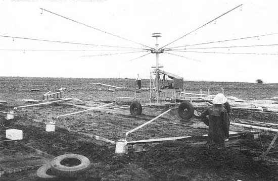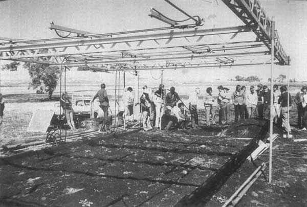 El método más económico y sencillo consiste en instalar la parcela y luego esperar que llueva; sin embargo la imprevisibilidad de las lluvias puede producir demoras indeseadas. La solución alternativa consiste en utilizar una lluvia "fabricada" artificialmente mediante el empleo de simuladores de precipitaciones tal como se presenta en el Capítulo 6. Las principales ventajas de utilizar un simulador son que se puede acelerar la obtención de resultados y controlar la cantidad y tipo de precipitación; sin embargo, la repetición del uso del simulador en la misma parcela, aunque mejora la situación, no reemplaza las replicaciones del experimento debido a que no elimina los desvíos de la variación del suelo. Si la parcela no es típica, el desvío estará presente todas las veces que se use el simulador; esto sólo se puede evitar estableciendo una parcela distinta para cada prueba. Se han elaborado algunos métodos para evitar la dificultad de trasladar el simulador. La Fotografía 5 muestra un simulador que puede realizar, en pequeña escala, seis ensayos repetidos en pequeñas parcelas octagonales. En Australia, una solución a mayor escala consistió en construir un simulador más grande y de materiales ligeros de modo que toda la estructura pudiera ser transportada por una grúa a otro lugar (Fotografía 6). En parcelas pequeñas, el simulador rotatorio que Figura en la Fotografía 7, se coloca entre dos parcelas que se pueden regar al mismo tiempo.