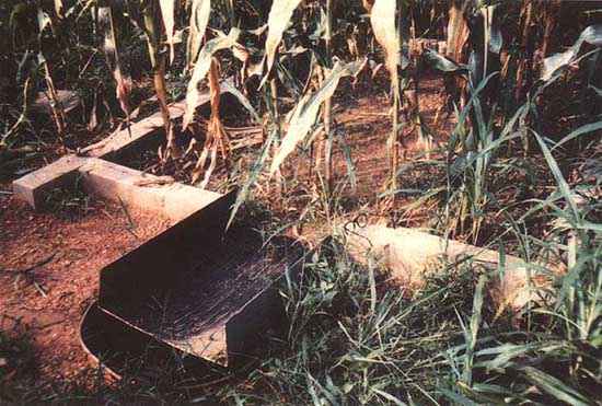 · Los bordes deben instalarse cuidadosamente, enterrarse lo suficientemente profundos como para evitar filtraciones por debajo, y ser lo suficientemente altos como para evitar desbordamientos (particularmente en el lado superior); las tablas de madera o las láminas de metal deben superponerse o unirse firmemente por los extremos para evitar filtraciones. Los bordes representados en la Fotografía 11 eran tiras de amianto-cemento de 2 m x 16 cm x 1 cm, enterradas 8 cm en el suelo, mantenidas verticales por medio de varillas de acero clavadas a cada lado, unidas por juntas y cubiertas por un sujetador formado por una lámina de metal.