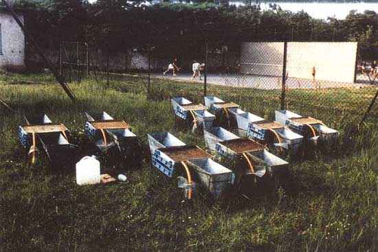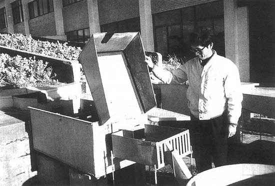 · Las microparcelas de uno o dos metros cuadrados pueden resultar adecuadas si el objetivo es una simple comparación de dos tratamientos y donde el tamaño de las parcelas es improbable que influya sobre el efecto de los tratamientos. Un ejemplo se ilustra en la Fotografía 8, donde el objetivo era demostrar y obtener una cifra aproximada de la diferencia de la escorrentía de superficie cuando se cubría el suelo en arbustos de té recién plantados. La escorrentía iba a parar a recipientes que se vaciaban después de cada lluvia. La precisión no era elevada, pero el método resultaba tan barato y sencillo que se podían efectuar diez repeticiones para obtener un punto de partida útil para las investigaciones en mayor escala. El experimento prosiguió durante diez años para evaluar cómo cambiaba la diferencia con el crecimiento progresivo de los arbustos.Otros ejemplos del empleo de microparcelas para pruebas sencillas están ilustrados en la Fotografía 9, que muestra el efecto de distintas poblaciones de maíz en el UTA, en Nigeria, y la Fotografía 10, que muestra pequeñas parcelas en recipientes para medir el efecto de la pendiente en la erosión causada por el salpicado de las gotas de agua. Las parcelas se levantaron por encima del nivel del suelo para medir solamente el efecto del salpicado de fuera de las parcelas; esto eliminaba el efecto del impacto de las gotas de agua dentro de las parcelas, pero permitía efectuar una comparación válida del efecto de la pendiente exclusivamente.