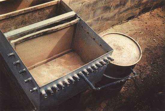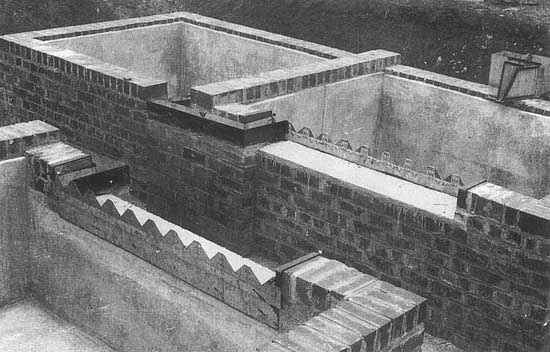 Sólo habrá unas pocas tormentas para las que se necesitará un almacenamiento máximo y muchas pequeñas tormentas producirán pequeños caudales de escorrentía. Si se colocan pequeños recipientes, dentro de cisternas más grandes, éstos captarán pequeñas escorrentías y podrán vaciarse y medirse más fácilmente. En momentos de grandes escorrentías los recipientes pequeños rebosan, pero la cisterna principal captura la escorrentía. La Fotografía 13 muestra un ejemplo en Kenya (Liniger 1990).