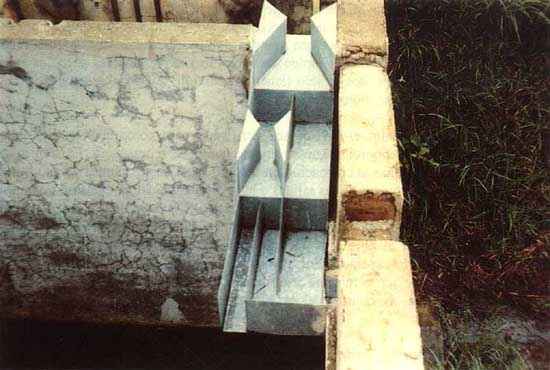 Es probable que todos los divisores obstaculicen en cierta medida la corriente por lo que existe la posibilidad de que se depositen sedimentos dentro del sistema. Esto no es un problema inevitable si el cálculo de los sólidos se basa en la suma de los sedimentos retenidos más una fracción exacta del caudal que se desecha. En consecuencia, en un sistema de tres tanques, como el que se muestra en la Fotografía 21, con dos divisores sucesivos de siete ranuras, la escorrentía total, o la pérdida total de suelo, es lo que se retiene en el canal colector y en el primer tanque, más siete veces el sedimento depositado en el segundo tanque, más 49 veces el sedimento depositado en el tercer tanque.
