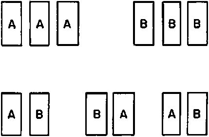 Para evitar esta causa de desviación, en un experimento de campo sencillo, digamos tres repeticiones de dos tratamientos, es decir, seis parcelas en total, el mejor método consiste en elegir tres bloques de dos parcelas cada uno y luego asignar los dos tratamientos al azar a las dos parcelas de cada bloque. Esto se puede realizar recurriendo a cualquier mecanismo aleatorio como tirar un dado, distribuir cartas o utilizar tablas de números aleatorios, cuyo resultado se aprecia en la línea inferior de la Figura 14.