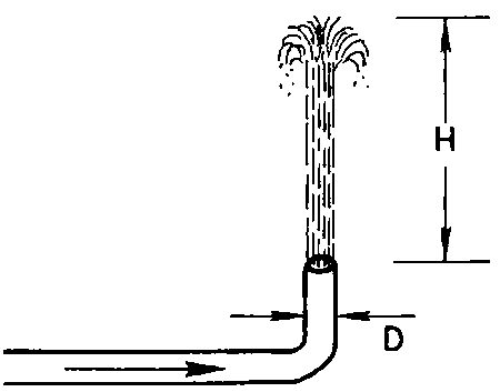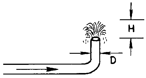 Si la corriente se puede desviar hacia una cañería de manera que descargue sometida a presión, el caudal se puede calcular a partir de mediciones del chorro. Si la cañería se puede colocar de manera que la descarga se efectúe verticalmente hacia arriba, la altura que alcanza el chorro por encima del extremo de la tubería se puede medir y el caudal se calcula a partir de una fórmula adecuada tal como se indica en la Figura 19. Es asimismo posible efectuar estimaciones del caudal a partir de mediciones de la trayectoria desde tuberías horizontales o en pendiente y desde tuberías parcialmente llenas, pero los resultados son en este caso menos confiables (Scott y Houston 1959).
