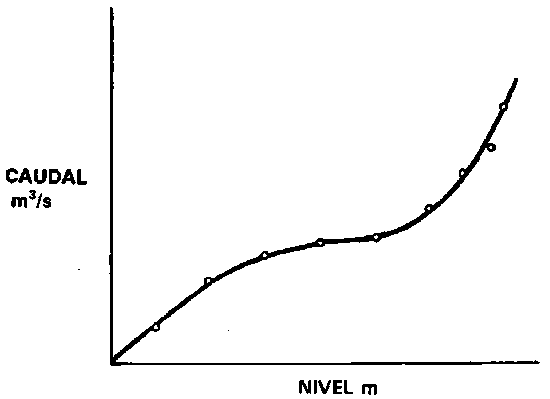 Si se efectúan mediciones del caudal por el método del molinete cuando el río fluye a profundidades diferentes, esas mediciones se pueden utilizar para trazar un gráfico del caudal en comparación con la profundidad de la corriente tal como se muestra en la Figura 23. La profundidad del flujo de una corriente o de un río se denomina nivel de agua, y cuando se ha obtenido una curva del caudal con relación al nivel de agua, la estación de aforo se describe como calibrada. Las estimaciones posteriores del caudal se pueden obtener midiendo el nivel en un punto de medición permanente y efectuando lecturas del caudal a partir de la curva de calibrado. Si la sección transversal de la corriente se modifica a causa de la erosión o de la acumulación de depósitos, se tendrá que trazar una nueva curva de calibrado. Para trazar la curva, es necesario tomar mediciones a muchos niveles diferentes del caudal, con inclusión de caudales poco frecuentes que producen inundaciones. Es evidente que esto puede requerir mucho tiempo, particularmente si el acceso al lugar es difícil, por lo que es preferible utilizar algún tipo de vertedero o aforador que no necesite ser calibrado individualmente, como se analiza más adelante.