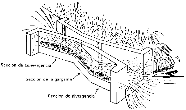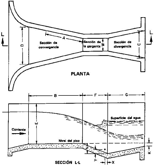 Este es otro aforador de profundidad crítica de un diseño similar al Parshall, que resulta particularmente útil como aforador portátil para mediciones eventuales de pequeños caudales en corrientes o canales sin revestir (Chamberlain 1952). Se puede prefabricar en fibra de vidrio (Fotografía 31) o en láminas finas de metal e instalarse en unos pocos minutos. Las dimensiones se dan en la Figura 36 y el calibrado en el Cuadro 9.