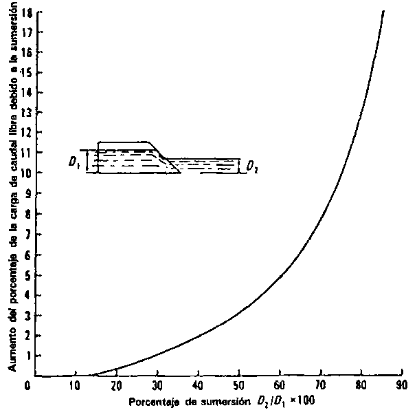 Los aforadores en H pueden funcionar parcialmente sumergidos y la corrección se indica en la Figura 35. La sumersión aguas abajo produce un efecto de remanso del agua en el aforador y un aumento de la profundidad del caudal. La curva de corrección muestra en cuánto se debe reducir la profundidad medida en el aforador para obtener la profundidad equivalente de un caudal libre con el fin de utilizar las tablas de calibración.
