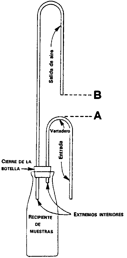 Otro método para obtener muestras a diversas profundidades del curso de agua es el empleo de muestreadores automáticos que toman una muestra a una profundidad predeterminada de la corriente. Un ejemplo típico es el que está representado en la Figura 40, utilizando una botella y dos tubos doblados. Los modelos comerciales utilizan tubos de cobre doblados a propósito, pero se puede utilizar un modelo más sencillo constituido por un tubo de plástico fijado a un marco rígido para que se mantenga en su sitio. La botella empieza a llenarse cuando la profundidad de la corriente alcanza el punto A y comienza el flujo de sifón a la botella; se para cuando la profundidad de la corriente se eleva al punto B que es la salida de la tubería que expele el aire. La amplitud de la toma de muestras se controla ajustando la distancia entre los puntos A y B. En su variante más sencilla los tubos de entrada y expulsión están curvados en forma de U; esto significa que la corriente en el muestreador está en ángulo recto con el curso de agua, lo cual puede obstaculizar la concentración de sedimentos; un modelo más perfeccionado tiene dos tubos con una segunda curva para dirigir las aguas arriba hacia la corriente, como en la Figura 42.