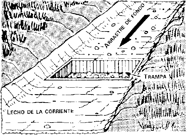 La forma más sencilla de calcular el arrastre de fondo consiste en cavar un agujero en el lecho de la corriente como en la Figura 45 y en retirar y pesar el material que cae en él. La cuenca aguas arriba de un vertedero o canal de aforo puede actuar análogamente como una trampa de sedimentos, pero es posible que no se sepa si se ha recogido todo el arrastre de fondo. En los lugares con grandes cargas de arrastre, este procedimiento puede necesitar mucho tiempo y resultar engorroso.