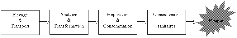 L'évaluation de l'exposition a été abordée de la production à la consommation (Figure 5.3). Le cadre modèle est modulaire dans sa nature et chaque étape de la chaîne d'approvisionnement est décrite par un modèle mathématique distinct. Ceci fournit un instrument souple aux gestionnaires des risques, lequel peut être utilisé pour estimer le risque pour la santé publique et explorer les impacts des interventions potentielles. Seuls les repas préparés à domicile et cuisinés en rôtissant au four sont actuellement pris en compte mais ceci pourrait être élargi à l'avenir.