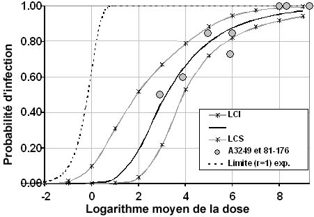 Figure 5.1: Relation dose-réponse beta-Poisson pour la probabilité d'infection concernant C. jejuni sur la base de données tirées d'essais d'alimentation humaine et de deux souches (A3249 et 81-176) et (paramètres modèles, a = 0,21, b = 59,95)
