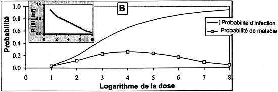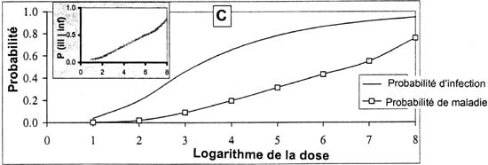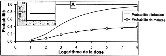 La probabilité de maladie dépend de la probabilité d'infection. En utilisant les données tirées de l'essai d'alimentation humaine, il ne semble pas y avoir de tendance claire en faveur du comportement de cette probabilité conditionnelle. Lorsque les données pour ces deux souches sont mises en commun, la probabilité conditionnelle a tendance à montrer une relation indépendante de la dose (Figure 5.2). Il importe de reconnaître que, même si la probabilité conditionnelle est indépendante de la dose, la probabilité ultime de maladie augmente avec la dose ingérée.