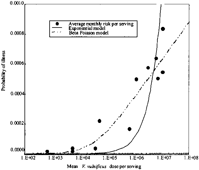 La figure 6.3 montre la relation dose-réponse pour V. vulnificus tel qu'estimée sur la base de l'exposition de la population consommatrice d'huîtres sensible aux Etats-Unis d'Amérique et des rapports épidémiologiques relatifs à V. vulnificus aux Etats-Unis d'Amérique. Comme pour les autres Vibrio spp., une famille de courbes dose-réponse a été générée en utilisant les techniques de ré-échantillonnage (bootstrap) mais ceci n'a pas été montré. La courbe dérivée est différente par rapport à l'autre Vibrio spp. parce qu'un point extrême de septicémie est modélisé au lieu d'un point extrême de maladie gastro-intestinale.