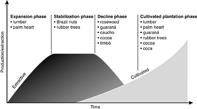 In the expansion phase, clear expansion of extraction may be observed, as in the case of palm hearts. The stabilization phase represents a balance between supply and demand. Decline is caused by the reduction of resources and increases in the cost of extraction, leading to a gradual fall-off in extraction; with the same effort as before, unitary costs increase, as in the case of rosewood (Aniba rosaeodora). Cultivation begins during the stabilization phase, when the conditions for cultivation are set by the availability of appropriate technologies, the lack of substitutes (natural or synthetic) and favourable prices.