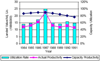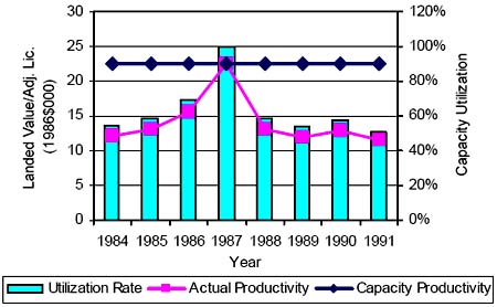 The harvesting productivity trend for the total inshore groundfish fleet from 1984 to 1991 is displayed in Figure 26. It shows a decline from 27.3 t/licence in 1984 to 16.7 t/licence in 1991. When the entire 1984-1991 period is used for analysis, the maximum productivity in 1984 is the basis for estimating annual capacities in both peak-to-peak analysis and DEA CRS model. When the study period is confined to 1986-1991, the maximum productivity during this period occurred in 1986 at 26.4 t/licence. As a result, capacity estimates based on the 1986-1991 data are consistently overestimated by 3.6 percent compared to those obtained using 1984-1991 data as shown in Table 5.