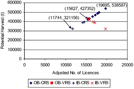 It appears that the peak-to-peak analysis and DEA CRS estimates give an indication of instant catchability at maximum efficiency while the DEA VRS estimates provide information on long-term potential yields. It is important to keep in mind that DEA only models the rising limb of a frontier production function with a constant slope or where the effect of diminishing marginal product prevails. As such, the results would be meaningless for overexploited fisheries beyond the long-term production limit, other than a mere indication of a troubled resource in the presence of a downward sloping. Because of the short time series involved and the various input/out control regimes in place, these estimates would likely be conservative and must be used with discretion.