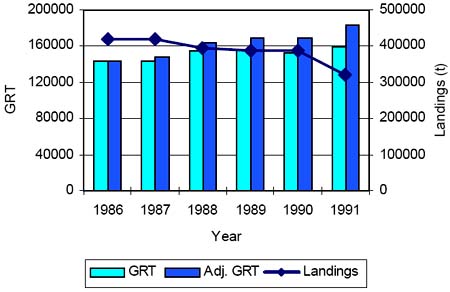 Given the above data constraints, only aggregate data from the existing databases are used for the preliminary analysis: annual total landings and landed values by species, total GRT, the number of species licences issued, the number of registered vessels and the number of registered fishers. The study period is chosen to begin with 1984, as more compatible and comprehensive Quebec harvesting and licensing data only became available in 1984 when DFO resumed management responsibilities for marine fisheries from the Province of Quebec.
