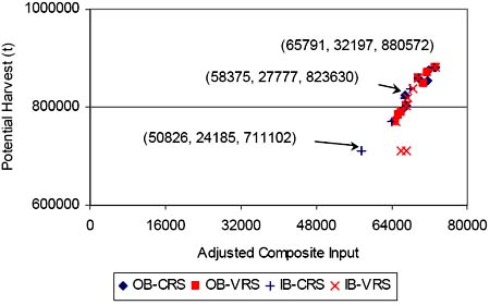 The fisheries data presented in this paper all involve multiple species and stocks. If DEA is to be used to estimate a more meaningful biological production function, stock-specific analysis and a better input indicator such as fishing effort would be required. On the other hand, the model results also appear to indicate that the multiple-species analysis would result in a higher level of capacity utilization than that based on the single-species analysis. This is somewhat expected as multiple-species fisheries usually provide required diversification and complementary sources of raw material and incomes to make most use of the existing capacity.