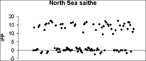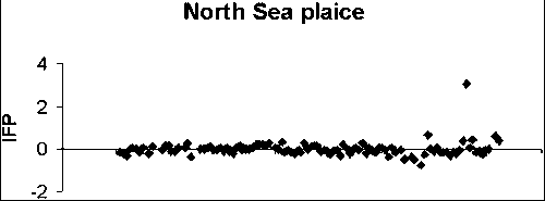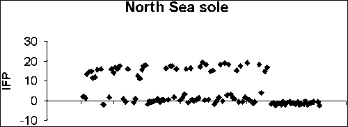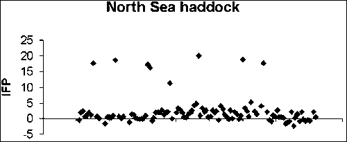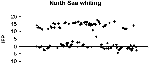 The index of technical efficiency, as calculated, exhibits a number of features. Within area 4, the beam trawl fleet appears to have a relatively constant index of fishing power with respect to cod, haddock and plaice. The numerical values fluctuate about a value of zero and hence, do not appear to indicate a real difference between the reference sub-fleet and the whole fleet. The picture for saithe, sole and whiting is more intriguing with the index appearing to separate into two distinct groups - with values fluctuating about a value of zero and also about a non-zero value which appear to be approximately independent of time. One can of course speculate as to the possible causes of these differences but a more detailed investigation might reveal a likely source of the difference.