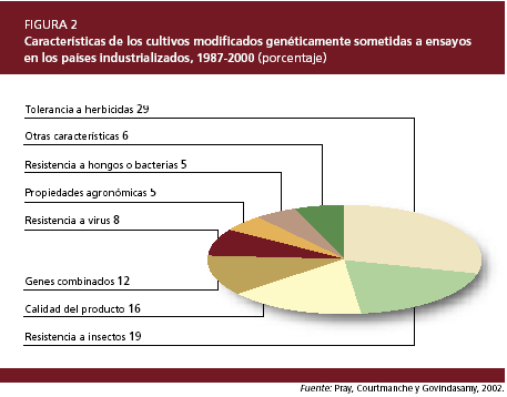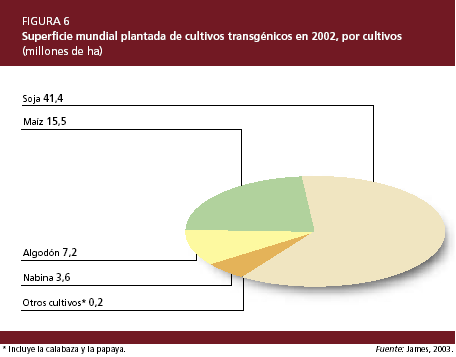 Los cultivos transgénicos más difundidos son la soja, el maíz, el algodón y la nabina. Las características más comunes son la tolerancia a herbicidas y la resistencia a insectos. La soja y la nabina tolerantes a herbicidas ocupan actualmente el 55 por ciento y el 16 por ciento, respectivamente, de la superficie mundial plantada de esos productos. Las variedades transgénicas de algodón y maíz actualmente cultivadas con fines comerciales incluyen características de resistencia a insectos y tolerancia a herbicidas, o una combinación de ambas, y representan el 21 y el 11 por ciento, respectivamente, de la superficie total destinada a estos cultivos (James, 2003). También se cultivan con fines comerciales pequeñas cantidades de papayas y calabazas transgénicas resistentes a virus. En la actualidad no se producen comercialmente en ningún lugar del mundo variedades transgénicas de trigo o arroz, que son los principales cereales alimentarios.