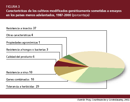 Casi dos tercios de los ensayos de campo que se realizan en los países industrializados y tres cuartos de los que se realizan en los países en desarrollo se centran en dos características, la tolerancia a herbicidas y la resistencia a insectos, o en una combinación de ambas (Figuras 2 y 3). Aunque la resistencia a insectos es una característica importante para los países en desarrollo, la resistencia a herbicidas puede que tenga menos interés en las zonas donde abunda la mano de obra agrícola. Por el contrario, características agronómicas de especial importancia para los países en desarrollo y las zonas de producción marginal, como el rendimiento potencial y la tolerancia a condiciones abióticas desfavorables (por ejemplo, la sequía y la salinidad) son objeto de muy pocos ensayos de campo en los países industrializados y aún menos en los países en desarrollo.