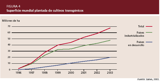 En 2003 se producían cultivos transgénicos con fines comerciales en un total de 67,7 millones de hectáreas en 18 países, lo que representa un aumento con respecto a los 2,8 millones de hectáreas cultivadas en 1996 (Figura 4). Esta tasa de difusión global de la biotecnología resulta impresionante, pero su distribución ha sido muy desigual. Seis países, cuatro cultivos y dos características representan el 99 por ciento de la producción mundial de cultivos transgénicos (Figuras 5-7) (James, 2003).