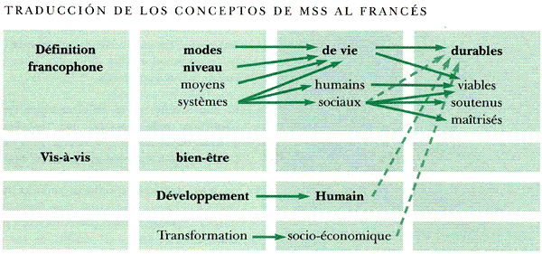 Dimensiones culturales. El marco de MSS se basa en gran medida en la experiencia adquirida en países anglófonos. Los especialistas de países de habla española y francesa experimentan alguna dificultad para trabajar con términos como "livelihoods" (medios de subsistencia), que no pueden traducirse por una palabra en sus idiomas. Al mismo tiempo, existe en los países de habla española y francesa un considerable caudal de experiencia relacionada con las mismas cuestiones pero quizás se ha conceptualizado de formas diferentes. Es necesario elaborar la forma de incorporar esta experiencia en el marco y generar formas del marco más apropiadas culturalmente. Aunque sustainable livelihoods puede traducirse al español como medios de subsistencia o sistemas de vida y desarrollo sostenibles, no parece haber un equivalente adecuado en francés. De hecho, ninguna de las posibles traducciones al francés que se indican a continuación capta plenamente el concepto.