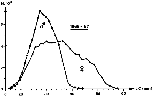 Fig. 4 - Length frequency polygon of shrimps caught on the Grand-Bassam fishing ground (Ivory Coast) in 1966/67 by the research trawler Reine Pokou