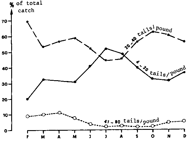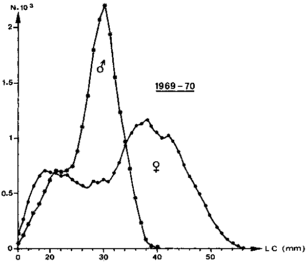 Fig. 5 - Length frequency polygon of shrimps caught on the Grand-Bassam fishing ground (Ivory Coast) in 1969/70 by the research trawler Reine Pokou