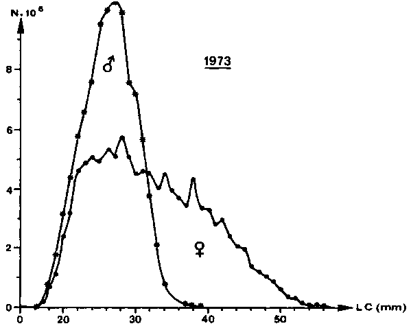 Fig. 6 - Length frequency polygon of shrimps caught on the Ivorian shelf by the Abidjan shrimp fleet in 1973