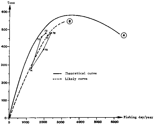 1/ The optimum exploitation level is arbitrarily defined as one for which the marginal catch rate (increase in catches for an increase in effort by one unit) is equal to 1/10 of the catch per unit effort on the virgin stock (Gulland and Boerema, 1973).At the rate of exploitation in lagoon observed in 1973 (55 percent), the maximum catch is 580 tons with a catch rate of 163 kg/day and the optimum catch is 570 tons with a catch rate of 202 kg/day. The corresponding theoretical yield curve at sea is represented on Figure 11 (Curve A). On the same figure have been represented the catch-effort figures observed since 1972 (a date which can be considered to mark practically the end of the expansion of the artisanal fishery). All the points are clearly below the theoretical curve; the curve (B) fitting these points has been traced in dots. The difference between these two curves amounts to 75 tons; it could mean that the level of exploitation in the lagoon has slightly increased since 1973. This assumption is confirmed by the fact that average catches in lagoon increased from 490 tons in 1972 and 1973, to 680 tons from 1974 to 1977.