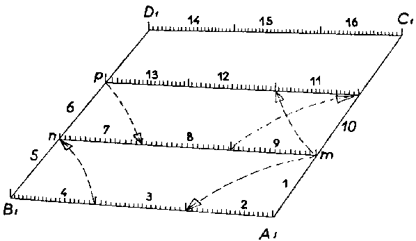 Les extrémités du câble sont placées l'une contre le premier piquet du côté A1-B1, l'autre contre le premier piquet de la parallèle mn (fig. 5); aux emplacements indiqués par des nuds sur le câble, les manuvres donnent un coup de houe. On opère de même successivement entre tous les piquets de même rang des deux parallèles. Cet exercice très simple n'exige qu'un surveillant attentif.