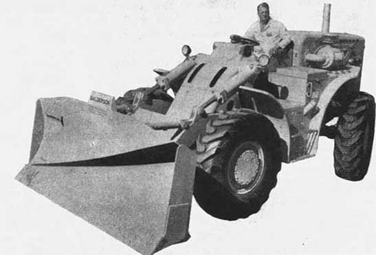 Dozer Balderson. - Consiste en un bâti intérieur monté sur deux bras soudés au châssis du Caterpillar-966 et d'une lame droite orientable ou en U suivant le travail à effectuer.