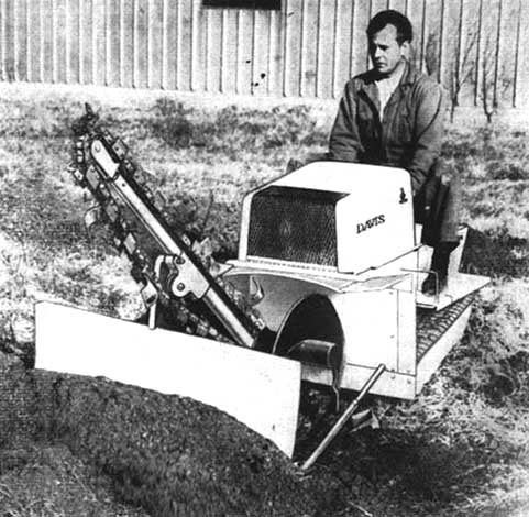 Fossoyeuse Davis T. 66. - Machine à creuser et remblayer les tranchées, montée sur chenilles à vitesse de marche variable commandée hydrauliquement avant et arrière, creuse sur 3 à 4 in. (7,6-10,1 cm) de largeur jusqu'à 66 in. (167 cm) de profondeur ou sur 12 in. (30,5 cm) de largeur et 30 in. (76 cm) de profondeur. Poids 1 350 lb (617 kg). Actionnée par un moteur de 12,5 cv. Possibilité d'adapter une flèche télescopique. Sur demande, traîneau spécial pour le transport.