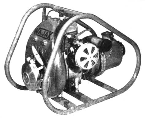 Pompe Wajax mark 2. - Pompe centrifuge horizontale à 4 temps, aspiration: 2 in. (5,08 cm), refoulement: 1,5 in. (3,8 cm), pas de vis forestier standard. Sert aussi bien pour combattre les incendies, etc., que pour remplir les réservoirs. Particulièrement robuste. Peut absorber de l'eau boueuse. Peut être utilisée par des personnes inexpérimentées. L'accouplement rapide de la pompe et du moteur facilite la mise en service et le transport. Entretien réduit au minimum. Poids: 15 lb (6,8 kg); débit: 76 imp. g.p.m. (345 1 /mn). Pression de sécurité de la soupape: 280 p.s.i. (20 kg/cm²). Moteur: monocylindre, 2 temps, refroidissement par air, consommation horaire de carburant: 8 gal. (36 litres). Dimensions hors-tout: hauteur 16,5 in. (42 cm); largeur 15 in. (38 cm), longueur 22 in. (55,9 cm). Poids de l'ensemble: 60 lb (27 kg).