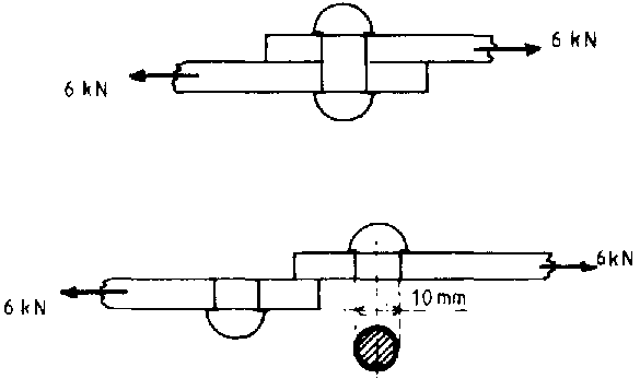 Note that the rivets do, in fact, strengthen the connection by pressing the two steel bars together, but this strength, due to friction, cannot be calculated easily and is therefore neglected, i.e., the rivet is assumed to give all strength to the connection.