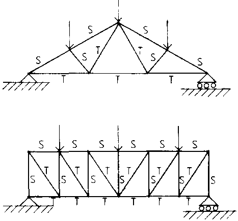 When bars are connected with pin joints and the resulting structure loaded at the joints, a structural framework called a pin jointed truss or lattice frame is obtained. The members are only subjected to axial loads and members in tension are called ties while members in compression are called struts.