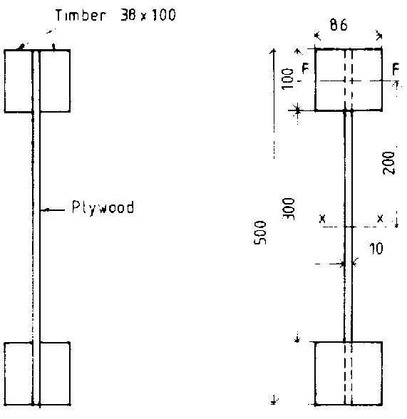 Determine the moment of inertia about the x-x axis and the y-y axis for the I-beam shown in the figure. The beam has a web of 10mm plywood and the flanges are made of 38 by 100mm timber, which are nailed and glued to the plywood web.