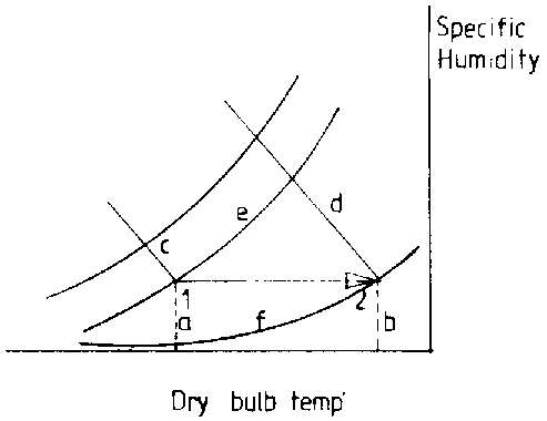 Point 2 has a higher temperature and specific humidity than 1. The heat added from a to b shows as sensible heat that caused a temperature rise from c to d end latent heat in the moisture that evaporated from e to f The relative humidity may or may not change.