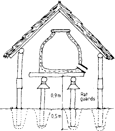 The advantage of bag storage is listed earlier. The disadvantage is that jutebags do not give any protection against insects which means that an insecticide has to be used. In some countries with a dry climate it is common practice to stack the bags on plinths and cover them with a tarpaulin for temporary storage. Examples are the hard stands used in Zambia and the groundnut pyramids near Kano in Northern Nigeria. However, if the grain is going to be kept for some time it is recommended to store the bags in a building. A simple store would be to use the ventilated maize crib that was used for drying, with the only difference being that the walls should be covered as protection against rain see figure 9.24.