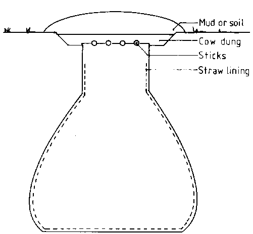 There are several types of pits, most of them flask shaped covered with sticks, cowdung and mud, or a large stone embedded in soft mud. The area should be free from termites and relatively dry.