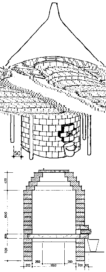 Brick walled silo or bins are suitable for small and medium size stores. The strengthening requirements makes them uneconomical when the height exceeds about 7-8 m. The wall may be made of bricks or blocks of mud, stabilized soil, burnt clay, stones or cement. To withstand the pressure from the grain the wall will need reinforcement depending on the size and strength of the building materials. Reinforcement can be reduced and even omitted by building the walls thick and heavy (gravity walls). Figure 9.21 shows a silo with gravity-walls where the bricks are placed radially. No reinforcement is needed for this size but more building material is required.