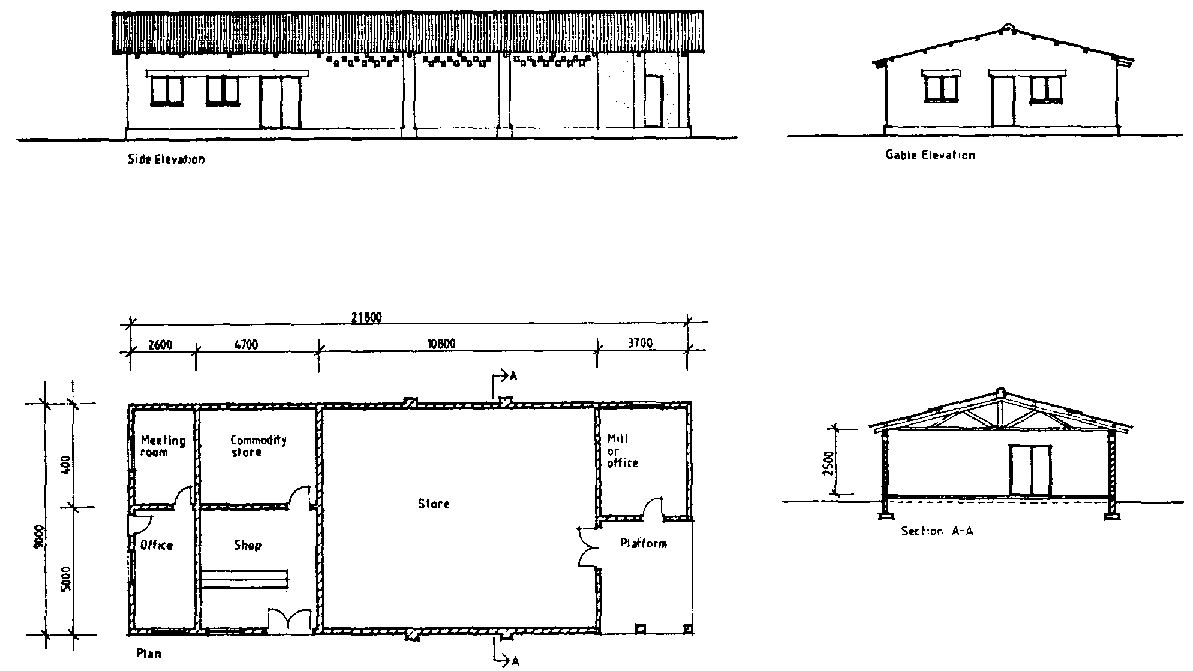If fine mesh is used to prevent insects from coming in through the ventilation openings it must be maintained regularly; dust should be brushed away and holes repaired immediately. Figure 9.26 shows a multi-purpose store with 90mē (extendable) storage space suitable for cooperatives and villages.