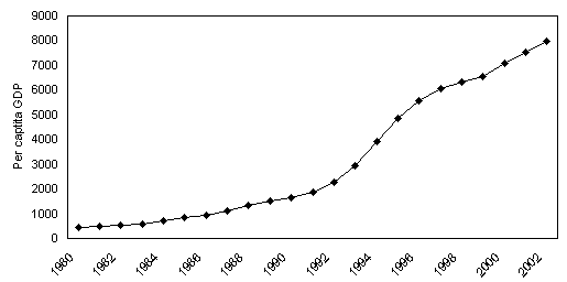 Over the past three decades, the Chinese population has expanded from 987 million to 1.267 billion (Table 1). There has also been an increasing trend towards urbanization, with the urban proportion of the population growing from 19 to 36 percent. Birth and death rates have been declining, while the natural growth rate has remained relatively stable (Figure 1). Additional demographic and development indicators are presented in Table 2. The declining birth and death rates of the past 20 years are causing the Chinese population to become older, with a decreased percentage in the 0 to 14 years age group and increases in the percentages of adults (15 to 64 years) and elderly (65 years and more). Population health indicators have improved over the past 30 years, and 90 percent of Chinese adults are literate. Although the proportion of population with access to safe sanitation has increased, it remains low, at less than 50 percent (State Statistical Bureau, 2002).