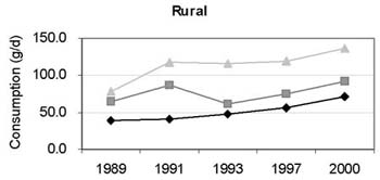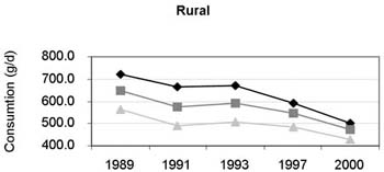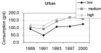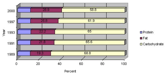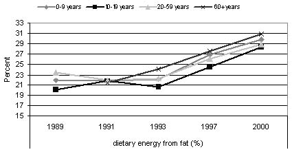 Trends in the achievement of various population nutrient intake goals are shown in Table 7. The percentage of dietary energy derived from fat increased in all age groups. The dietary fat intake in suburban and town areas increased rapidly. The proportion of energy from fat reached 30 percent in suburban and town areas, and 35 percent in urban ones. The percentage of people consuming at least 400 g of fruits and vegetables a day dropped for all age groups, while those consuming less than 5 g of sodium chloride also decreased. In 1997, urban adults intake of cholesterol reached 361.6 mg/d, exceeding the recommended daily allowance (RDA) of 300 mg/d. The cholesterol intake of 54 percent of urban adults was more than 300 mg/d. The cholesterol intakes of suburban and town residents increased to 250 mg/d and 270 mg/d, respectively, but that of rural residents remained stable at a lower level of 150 mg/d. High intakes of dietary fat, sodium and cholesterol increase the risk of chronic diseases such as obesity, diabetes, cardiovascular disease (CVD) and some cancers, especially in middle-aged and elderly populations.