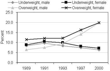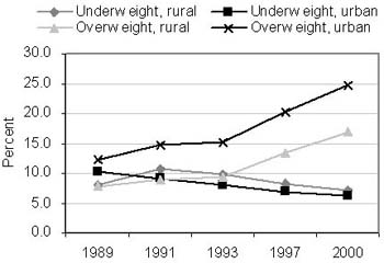China is facing simultaneous challenges of malnutrition and overnutrition. The growth of children and teenagers has improved steadily. The prevalence of malnutrition and nutrition deficiencies such as stunting and underweight in children under six years of age, has decreased continuously (UNESCAP, 2004; UNDP, 2004; Du et al., 2002; Campbell Parpia and Chen, 1998; Chang et al., 1996; Zhai et al., 2004; Wang, Monteiro and Popkin, 2002). Deficiencies of micronutrients such as iron and vitamin A are still important public health problems in both urban and rural populations. The prevalence of malnutrition is still high: in 2002, 14.3 percent of preschool children were stunted, while 7.8 percent of preschool children and 6.8 percent of adults were suffering from underweight (NNS, 2005). On the other hand, the prevalence of overweight and obesity has risen at a relatively high degree, and stood at 22.7 percent for the overall population in 2002 (NNS, 2005).