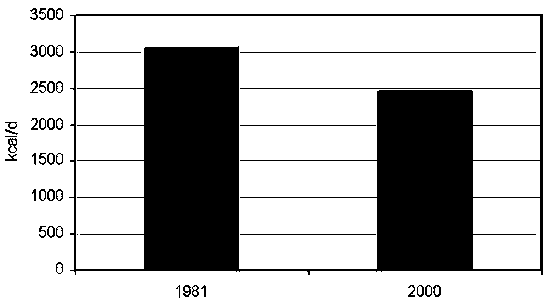 Data from NNI national surveys conducted in 1981 and 2000 show that the mean per capita calorie intake decreased from 3 057 kcal in 1981 to 2 460 kcal in 2000 (Aly et al., 1981; Hassanyn, 2000) (Figure 5).