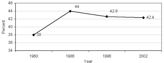Regarding the per capita consumption of protein, the protein intake from cereals decreased from 61.2 g/day and 54.9 percent of total protein intake in 1981, to 52 g/day and 48.2 percent of total protein intake in 2000. Per capita consumption of protein from meat increased from 16.3 g/day and 18.8 percent of total protein intake, to 25.5g/day and 26.8 percent of total protein intake (Figure 7).