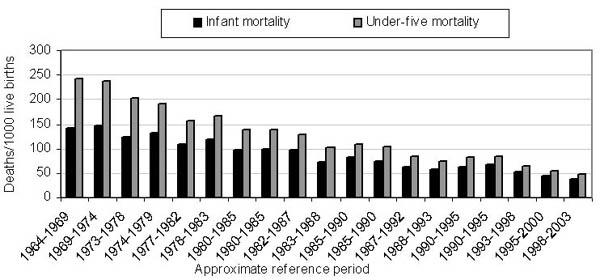 Childhood mortality rate. The 2003 Egypt Interim Demographic and Health Survey (EIDHS, 2003) estimates that childhood mortality is becoming increasingly concentrated in early infancy. For the five-year period before the survey, the under-five mortality rate was 46 per 1 000 births, and the infant mortality rate 38 per 1 000 births. More than 80 percent of early childhood deaths in Egypt were occurring in infants under the age of one year. Neonatal and post-neonatal mortality rates (23 and 15 per 1 000, respectively) show that three-fifths of infant deaths occur within the first month of life. Estimates of childhood mortality trends over the last 40 years (1964 to 2003) show a substantial decrease. Overall, the probability of dying before the age of five years has fallen by about 80 percent, from 243 deaths per 1 000 live births in the period 1964 to 1969, to 46 in the period 1998 to 2003 (Figure 3).