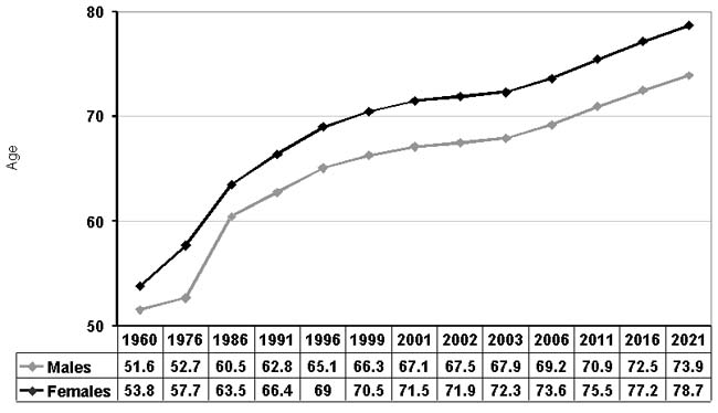 Life expectancy. Life expectancy increased for males from 52.7 years in 1976 to 67.9 in 2003, and for females from 57.7 years in 1976 to 72.3 in 2003 (Figure 4). Life expectancy is anticipated to reach 73.9 and 78.7 years for males and females, respectively, in 2021 (CAPMAS, 2004).